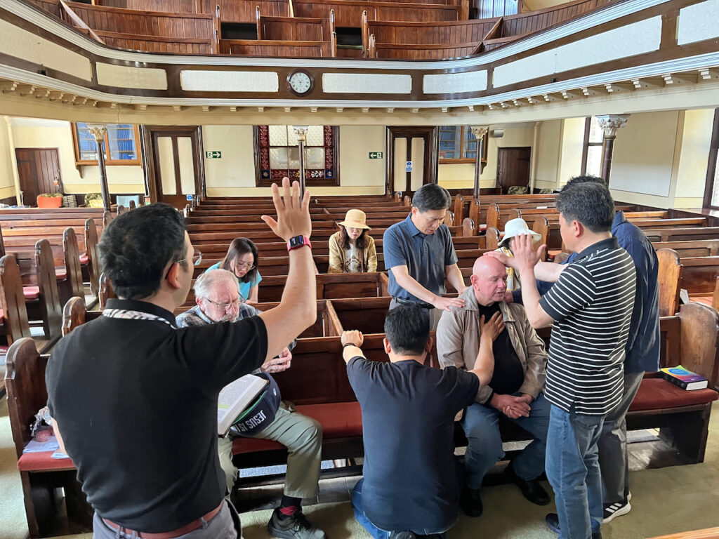 λŒ€ν‘œ μ§‘μ‚¬λ‹˜μ΄ μžλ¦¬μ— λŒμ•„κ°€μ‹  ν›„ ν•œ λͺ©μ‚¬λ‹˜κ»˜μ„œ λ‚˜μ™€ 짧게 말씀을 ν•œ 절 λ‚˜λˆ„μ‹œκ³ , 기도 μ„ κ΅νŒ€μ΄ ν•œκ΅­μ—μ„œ 이곳 μ›¨μΌμ¦ˆλ‘œ 온 이유λ₯Ό μ„€λͺ…ν•˜μ…¨λ‹€. 이 λ•Œ κ²Έμ†ν•˜κ²Œ β€œμ—¬λŸ¬λΆ„λ“€μ˜ 쑰상듀이 λ°±μ—¬λ…„ 전에 μš°λ¦¬μ—κ²Œ μ°Ύμ•„ μ˜€μ…”μ„œ λ³΅μŒμ„ μ „ν•΄ 주셨기에 우리 ν•œκ΅­ κ΅νšŒκ°€ μžˆμ„ 수 μžˆμ—ˆμŠ΅λ‹ˆλ‹€, κ·Έ μ€ν˜œμ— λŒ€ν•œ λΉšμ„ μ‘°κΈˆμ΄λ‚˜λ§ˆ 갚고 μ‹Άμ–΄ μš°λ¦¬κ°€ ν•œκ΅­μ—μ„œ μ™”μŠ΅λ‹ˆλ‹€. 같이 μ—¬λŸ¬λΆ„λ“€κ³Ό ν•¨κ»˜ κΈ°λ„ν•˜κΈΈ μ›ν•©λ‹ˆλ‹€β€ 라고 λ§μ”€ν•˜μ…¨λ‹€. μš°λ¦¬κ°€ μ°Ύμ•„κ°„ λͺ¨λ“  κ΅νšŒμ— μ΄λ ‡κ²Œ μ„€λͺ…ν•˜λ©΄ λŒ€λΆ€λΆ„ 영ꡭ μ‹ μžλ“€μ€ λ§ˆμŒμ„ μ—΄λ©° 같이 기도λ₯Ό ν•˜λŠ” 것을 보게 λœλ‹€.