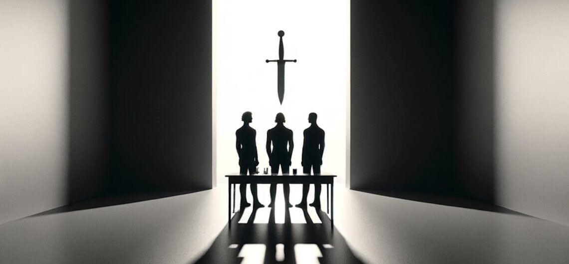 Initially, he moved with careful, understated steps, evading the attention of the other two. Then, in a moment of unexpected ferocity, he lunged for the sword. Gripping it with a resolve fuelled by his ideology, he turned it into a lethal instrument of his beliefs. With a swift, merciless stroke, he struck down both the Christian and the libertarian. This brutal act was a chilling embodiment of the overpowering and ruthless nature of collectivist totalitarianism.
