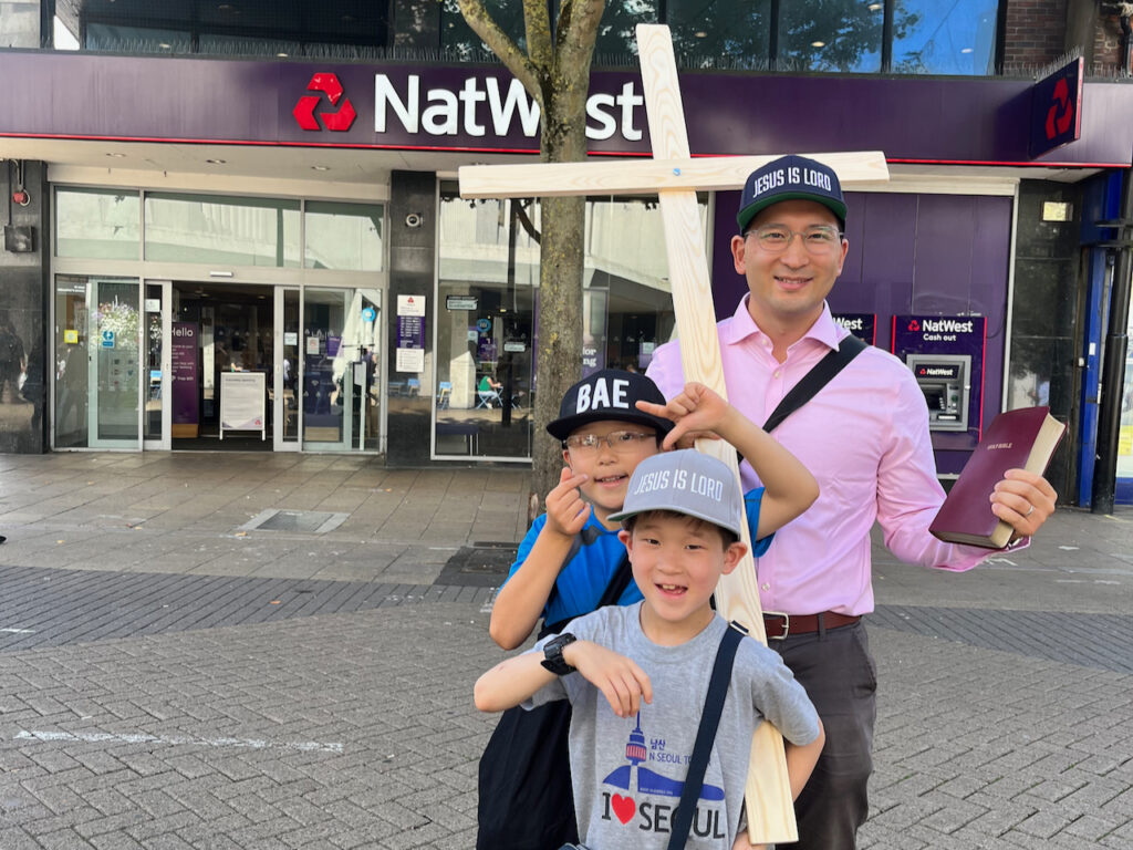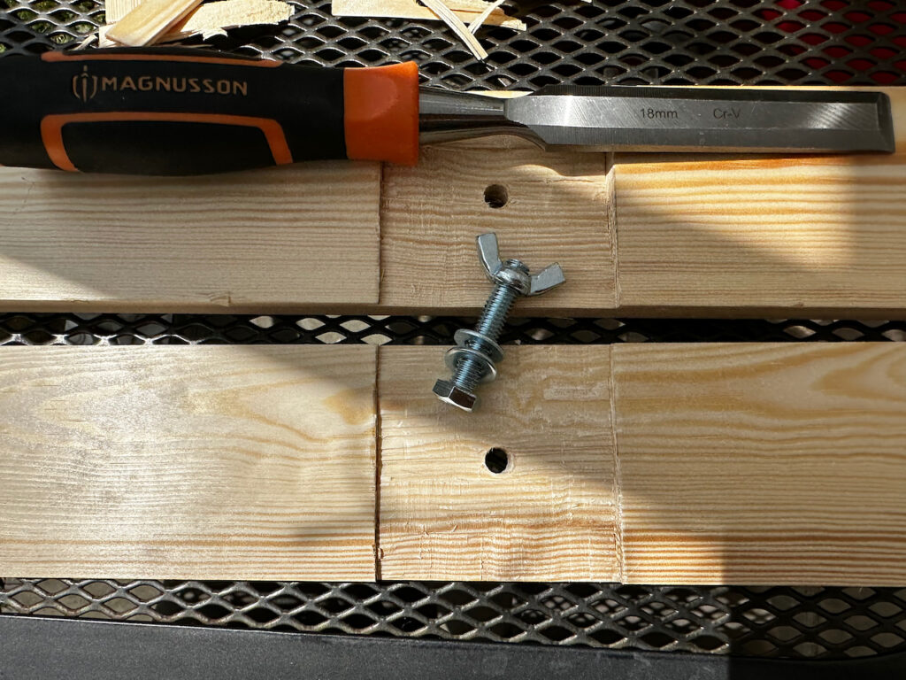 I made a wooden cross for street evangelism. A trip to the B&Q, buy 15x68x2400mm pine strip wood planks, and some nuts and bolts. Cut to length, drill some holes, and file down some notches:
